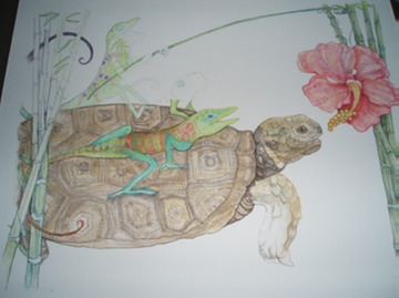 This is a page that I'm painting for the new book. My grandson has been sitting on my lap as I paint and last week he met a tortoise on his way to school.